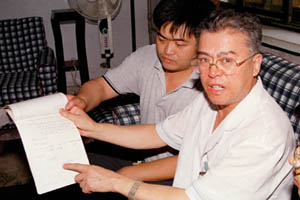 李洪志曾住院手術(shù)(二) ![]() 8月3日,吉林省人民醫(yī)院發(fā)現(xiàn)李洪志曾在該醫(yī)院做過(guò)闌尾炎手術(shù)的住院病歷。李洪志在1984年7月8日早晨突 發(fā)急性化膿性闌尾炎,住進(jìn)吉林省人民醫(yī)院普通外科,發(fā)燒38.9度,于當(dāng)天下午實(shí)施闌尾切除手術(shù),住院10天。由于當(dāng) 時(shí)醫(yī)生筆誤,錯(cuò)將李洪志寫(xiě)作“李宏志”,根據(jù)病歷上的患者年齡、工作單位、家庭住址及家屬(李妻)的手術(shù)簽字,可確定 患者即李洪志。圖為當(dāng)時(shí)為李洪志做手術(shù)的主治醫(yī)師、現(xiàn)吉林省人民醫(yī)院副院長(zhǎng)李英杰(右)講述當(dāng)年為李洪志確診手術(shù)的情 景。張寶江攝(新華社稿 傳真照片) |