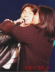 女歌迷擁吻獲華語(yǔ)歌曲排行第一的劉德華 2000年1月29日 08:11 ![]() 華語(yǔ)榜中榜九九最佳歌曲、歌手評(píng)選暨頒獎(jiǎng)典禮二十七日晚在北京隆重舉行,來(lái)自香港、臺(tái)灣和內(nèi)地的幾十名著名歌手匯聚京城。香港著名歌星劉德華演唱的《愛(ài)你一萬(wàn)年》獲排行第一,并獲得跨世紀(jì)男歌手獎(jiǎng)。圖為在演出現(xiàn)場(chǎng)一名女歌迷沖上臺(tái)擁吻正在演唱的劉德華。作者:錢興強(qiáng) |