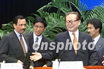 圖文:江澤民會見文萊蘇丹 2001年5月15日 15:45 ![]() 中國國家主席江澤民與文萊蘇丹博爾基亞,十五日在北京人民大會堂出席APEC人力資源能力建設(shè)高峰會開幕式。中新社記者 毛建軍 攝