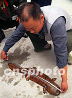 圖:為娃娃魚尋找放生地 2001年10月05日 10:35 ![]() 由于黑河引水工程,陜西省周至縣黑河大橋下游淺灘近日頻頻發(fā)現(xiàn)娃娃魚,大橋收費(fèi)站的工作人員出于對(duì)珍稀動(dòng)物的保護(hù),準(zhǔn)備將這條重三公斤、身長(zhǎng)七十五厘米的娃娃魚尋找放生地,以保護(hù)這一地區(qū)的生態(tài)平衡。中新社圖 尚鴻珠 攝 |