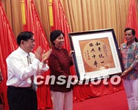 圖:李勁祥向宋氏祖居基金會贈送蔣緯國先生手書復(fù)制件 2001年10月18日 22:15 ![]() 歐美同學(xué)會副會長、全球華人反獨促統(tǒng)聯(lián)盟副會長李勁祥先生(左一)18日在贈送把一九九三年蔣緯國先生親贈與他的“和平統(tǒng)一、振興中華”的手書復(fù)制件贈送海南向宋氏祖居基金會。中新社圖 王辛莉 攝 |