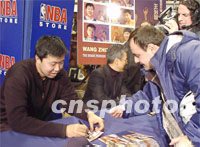 ![]() 今天中午,達(dá)拉斯小牛隊(duì)的高大中鋒王治郅出現(xiàn)在紐約市中心NBA專(zhuān)賣(mài)店里。他是第一個(gè)被美國(guó)職業(yè)籃球隊(duì)選中的中國(guó)球員。為表彰他的卓越才華和對(duì)籃球運(yùn)動(dòng)的貢獻(xiàn),一套以他個(gè)人肖像為主題的法定郵票今天開(kāi)始公開(kāi)發(fā)售。中新社記者 陳建 攝