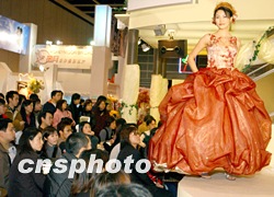 圖:香港婚紗展上模特展示紅色婚紗 2002年02月02日 20:30 ![]() 規(guī)模盛大的香港婚紗展2月2日在香港會(huì)展中心開幕,除了傳統(tǒng)的白色婚紗外紅色婚紗格外受歡迎。中新社傳真任晨鳴攝