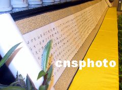 圖:佛教信眾謝宗林捐贈二十四米《金剛經(jīng)》 2002年04月02日 16:40 ![]() 佛教信眾謝宗林4月2日向海南三亞南山海上觀音捐贈二十四米《金剛經(jīng)》佛教書法長卷,被藏于一百零八米海上觀音金剛洲基座內(nèi)。中新新社記者 關(guān)向東 攝