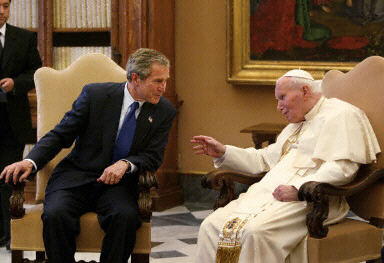 圖:布什會(huì)見羅馬教皇 討論天主教性丑聞事件 2002年05月29日 11:21 美國總統(tǒng)布什在梵蒂岡與羅馬教皇約翰·保羅二世舉行短暫會(huì)晤。會(huì)晤中談及有關(guān)中東危機(jī)和美國羅馬天主教性丑聞等問題。法新供中新