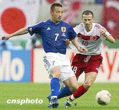 圖:1/8決賽日本VS土爾其 中田英壽與厄爾岡爭(zhēng)搶 2002年06月18日 15:51 ![]() 6月18日下午,韓日世界杯第7場(chǎng)1/8決賽日本隊(duì)與土爾其隊(duì)的比賽在日本仙臺(tái)利府町體育場(chǎng)進(jìn)行,目前比賽正在進(jìn)行,場(chǎng)上比分為土爾其隊(duì)1-0領(lǐng)先。圖為中田英壽(左)與厄爾岡(右)爭(zhēng)搶。