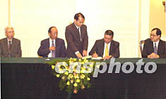 圖:澳門政府與銀河公司簽署博彩經(jīng)營(yíng)批給合同 2002年06月27日 11:13 ![]() 澳門特區(qū)行政長(zhǎng)官何厚鏵二十六日在澳門政府總部輿銀河娛樂場(chǎng)股份有限公司董事呂志和(左二)、范少朋(左一)簽署娛樂場(chǎng)幸運(yùn)博彩經(jīng)營(yíng)批給合同。中新社記者 李剛 攝
