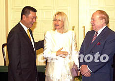 ![]() 澳門特區(qū)行政長(zhǎng)官何厚鏵二十六日輿銀河簽署協(xié)議后,和美國(guó)拉斯維加斯金沙公司董事長(zhǎng)、銀河主要股東肖登·艾德森夫婦親切交談。中新社記者 李剛 攝