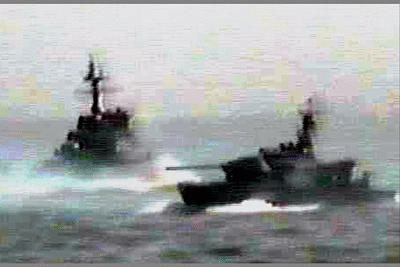 圖:朝鮮警備艇與韓國海軍高速艦在海面對峙 2002年06月29日 19:57 ![]() 韓國和朝鮮艦艇今晨在黃海海面發(fā)生交火,造成韓方4人死亡,至少18人受傷。此圖顯示朝鮮警備艇(右)與韓國海軍高速艇正在對峙之中。圖片為現(xiàn)場韓國海軍作戰(zhàn)部隊攝像機拍攝。(韓國聯(lián)合通訊社圖) 相關(guān)報道:韓國總統(tǒng)金大中的小兒子涉嫌受賄等罪出庭受審 相關(guān)報道:事件綜述:朝韓雙方互相指責 稱將采取應(yīng)對措施 相關(guān)報道:韓朝海上交火事件:韓軍艇長等4人死亡22人受傷 相關(guān)報道:朝韓艦艇在海上交火 金大中今晚不看世界杯比賽 相關(guān)報道:新聞背景:1998年至今韓朝兩國海難事故大事記 相關(guān)報道:圖文:朝鮮和韓國軍艦發(fā)生交火 4名韓國人死亡