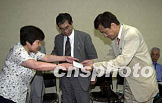 ![]() 花岡事件受難者聯(lián)誼會(huì)2日在日本國會(huì)發(fā)表《致日本內(nèi)閣函》,要求日本政府正視強(qiáng)擄、奴役中國戰(zhàn)俘勞工的歷史,承擔(dān)政治、法律、道義上的責(zé)任,公開、正式地向中國人民謝罪。圖為受難者家屬代表王紅向日本國會(huì)議員提交函件。中新社記者 陶光雄 攝
