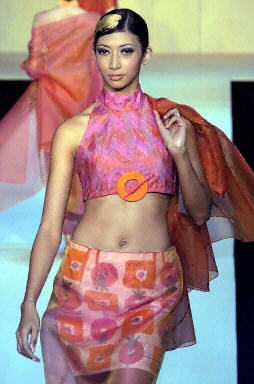 圖:印度時裝周上模特展示新款時裝作品 2002年08月03日 20:47 8月3日,在印度新德里時裝周上模特展示高級設計師的新款時裝作品。