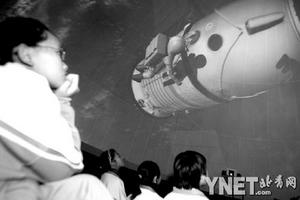 抬頭仰望,漫天的星斗。北京57中學(xué)的學(xué)生坐在學(xué)校的穹幕劇場(chǎng)里,宛如身在太空一樣,月球在他們的頭頂輕輕地轉(zhuǎn)動(dòng)。隨著一聲號(hào)令,嫦娥一號(hào)拔地而起,從他們的頭頂奔向月球。不少的學(xué)生忍不住想要摸一把“嫦娥”,讓“嫦娥”帶著他們一起飛向月球。昨天下午1點(diǎn)30分,初一學(xué)生江聰?shù)、王聿倫和同學(xué)們一起,這樣立體地重溫了“嫦娥”奔月的震撼瞬間。