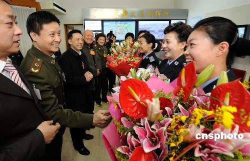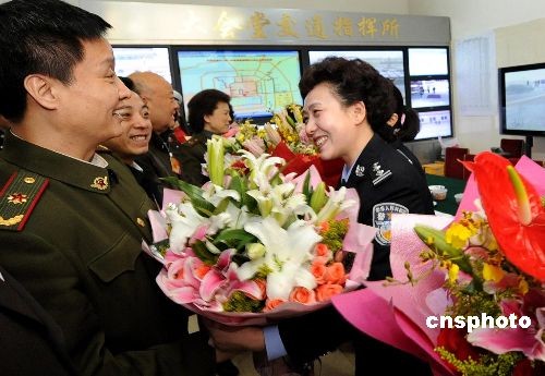 3月8日,國際婦女節(jié),出席十一屆全國政協(xié)會議的部分文藝界政協(xié)委員來到北京人民大會堂交通指揮所,向?yàn)閮蓵⻊?wù)的女交警們獻(xiàn)上鮮花,表達(dá)節(jié)日的祝賀。中新社發(fā) 劉英毅 攝