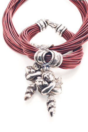 今季的珠寶系列,木質(zhì)、純銀、珍珠和皮繩等多材質(zhì)的混合配搭格外搶眼。有將木材和純銀和諧地組合在一起,也有將米色或谷倉紅色的多條皮繩交織在一起形成頸圈與手鐲,配以銀制青銅造型的吊墜,張揚地闡釋著原始的自由。