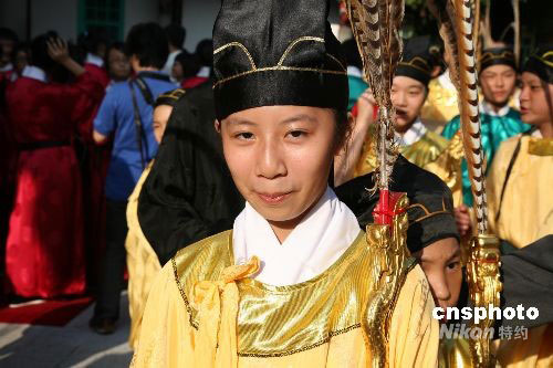 十月五日舉行的臺(tái)北祭孔大典上,大龍小學(xué)的佾生伴著樂(lè)曲起舞,要完成九十六個(gè)舞蹈動(dòng)作,佾生們要練一年以上并寫出動(dòng)作記錄才能記住,因此被戲稱為大龍小學(xué)的“秘笈”。圖為可愛(ài)的小佾生。中新社發(fā) 楊旭 攝