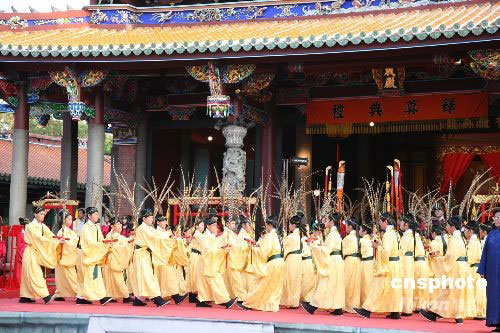 十月五日舉行的臺北祭孔大典與往年不同,佾舞及雅樂演出由六佾變?yōu)榘速从闪辛腥,增加到八行八列六十四名佾生。中新社發(fā) 楊旭 攝