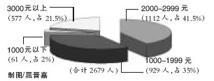 截至昨日,網(wǎng)上調(diào)查問(wèn)及作為一名大學(xué)生,希望工作單位給予怎樣的報(bào)酬時(shí)?參加投票的2679人中,選擇2000元—2999元的最多,為1112人;929人選擇1000元—1999元,選擇1000元以下的為61人,有577人期望3000元以上月薪,即近八成(78%)畢業(yè)生期望月薪在3000元以下。