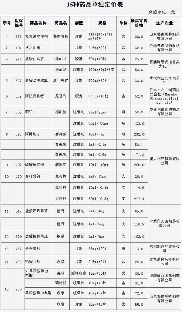 國家發(fā)改委公布15種藥品單獨定價方案(附名單)