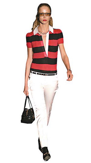 一直以來走性感路線的BottegaVeneta在2006年春夏推出了搶眼的紅白條紋短裝,具有線條感的豎條紋束胸式上衣包裹了女士們上半身的美好曲線,而下半身搭配一件紅白相間的條紋短褲,既富有動感又顯得性感迷人。Gucci也以紅黑搭配的條紋打造了現(xiàn)代都市女性的風(fēng)采,深V領(lǐng)的紅黑條紋T恤搭配一件剪裁良好的白色長褲,行走于都市街頭,展現(xiàn)出一種獨特的英姿。