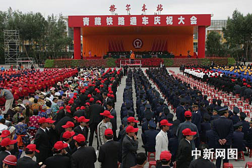 七月一日上午,青藏鐵路通車(chē)慶典在青海格爾木火車(chē)站南廣場(chǎng)舉行。圖為通車(chē)慶典會(huì)場(chǎng)。中新社記者 武仲林 攝