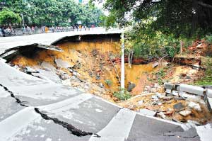 昨日下午4時(shí)許,記者來(lái)到事故現(xiàn)場(chǎng),窟窿剛好處于雙橋路和珠江大橋的引橋交界處, 面積大約有100平方米,深約5米?吡倪吘,水泥的路面碎裂,讓人覺(jué)得隨時(shí)可能會(huì)掉進(jìn)里面。原本在路邊的一根路燈栽入了窟窿中,兩棵樹(shù)也陷了進(jìn)去。警方在現(xiàn)場(chǎng)拉起了警戒線,地鐵公司等相關(guān)部門的工作人員正緊張?zhí)幚怼?/p>