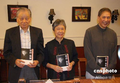 九月三十日下午,女作家陳若曦(中)在臺北舉辦新著《堅(jiān)持·無悔——陳若曦七十自述》出版發(fā)布會。著名作家白先勇(右)前來向當(dāng)年臺大老同學(xué)祝賀。陳若曦一九三八年生于臺北縣中和,臺大外文系畢業(yè)后留學(xué)美國,獲約翰霍普金斯大學(xué)寫作系碩士。一九六六年與丈夫回到中國大陸,一九七三年到香港居住,先后移居加拿大、美國,近年定居臺北。其作品曾被譯為英、德、日、法、挪威等文字。中新社發(fā) 耿軍 攝