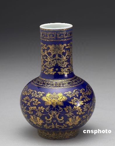 圖為展出的“磁胎洋彩金番花青地紙槌瓶”。