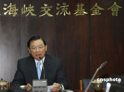 10月21日中午,臺(tái)灣;鶗(huì)董事長江丙坤召開臨時(shí)記者會(huì),譴責(zé)暴力襲擊來臺(tái)灣進(jìn)行學(xué)術(shù)訪問的海協(xié)會(huì)副會(huì)長、廈門大學(xué)傳播學(xué)院院長張銘清。中新社發(fā) 耿軍 攝