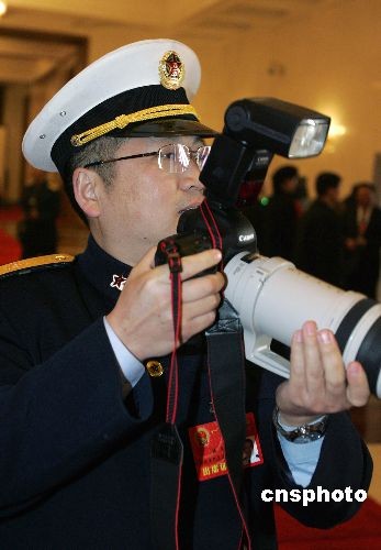 3月10日上午,十一屆全國人大一次會(huì)議在北京人民大會(huì)堂舉行第三次全體會(huì)議,精通攝影的全國人大代表、新晉海軍少將汪玉為出席會(huì)議的解放軍代表團(tuán)拍照。汪將軍系海軍裝備研究院某研究所副所長兼總工程師。中新社發(fā) 任晨鳴 攝