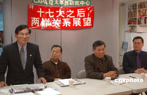紐約僑學(xué)界當(dāng)?shù)貢r(shí)間十月十九日舉行座談會(huì),展望中共十七大后的兩岸關(guān)系。與會(huì)代表認(rèn)為,中共總書記胡錦濤在十七大上所作報(bào)告中有關(guān)臺(tái)灣問題的論述言簡(jiǎn)意賅,既展示了相當(dāng)?shù)纳埔猓殖錆M自信。圖為紐約中國(guó)和平統(tǒng)一促進(jìn)會(huì)會(huì)長(zhǎng)花俊雄(右一)在座談會(huì)上發(fā)言。中新社發(fā) 劉小青 攝