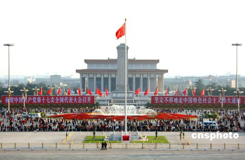十月二十日,中共十七大召開期間北京天安門廣場游人如常參觀,其中的“祝賀中國共產(chǎn)黨第十七次全國代表大會召開”、“堅定不移地走中國特色社會主義偉大道路”標語鮮艷奪目。中新社發(fā) 廖攀 攝