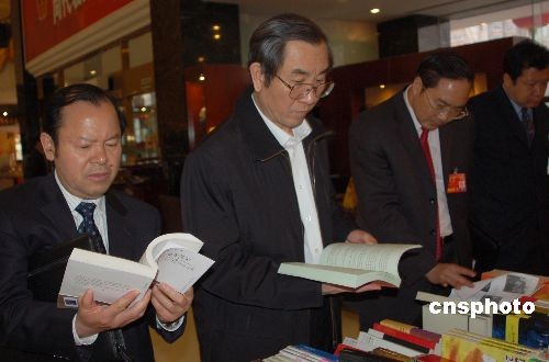 3月8日下午,參加完十一屆全國(guó)人大一次會(huì)議第二次全體會(huì)議的全國(guó)人大代表、廣西壯族自治區(qū)主席馬飚(左二)等人,在廣西大廈內(nèi)的書攤前選購(gòu)圖書,會(huì)議間隙學(xué)習(xí)“充電”。中新社發(fā) 劉萬強(qiáng) 攝