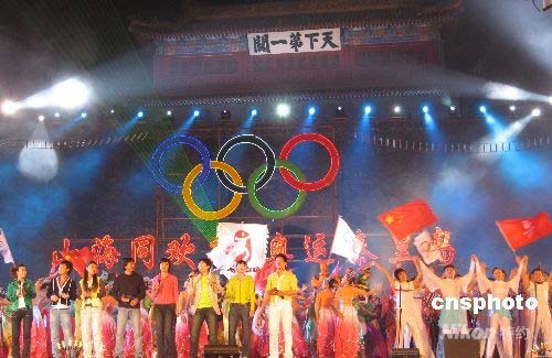 圖:秦皇島民眾山海關(guān)前歡慶奧運(yùn)倒計(jì)時(shí)一百天