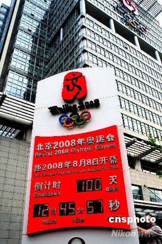 4月30日上午,顯示距北京2008年奧運(yùn)會100天的北京奧運(yùn)大廈倒計(jì)時(shí)牌吸引記者拍攝。當(dāng)日京城隆重舉行系;顒,表達(dá)京城各界人士盼望北京奧運(yùn)會的喜悅心情。 中新社發(fā) 宋吉河 攝