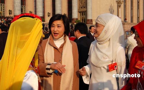 3月5日,十一屆全國(guó)人大一次會(huì)議在北京人民大會(huì)堂開(kāi)幕。香港鳳凰衛(wèi)視名主播吳小莉(左二),會(huì)前在大會(huì)堂前采訪少數(shù)民族代表。中新社發(fā) 劉萬(wàn)強(qiáng) 攝