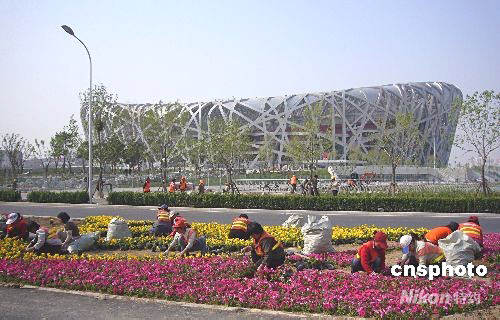 圖:"鳥巢"周邊植花迎奧運(yùn)倒計(jì)時(shí)百天