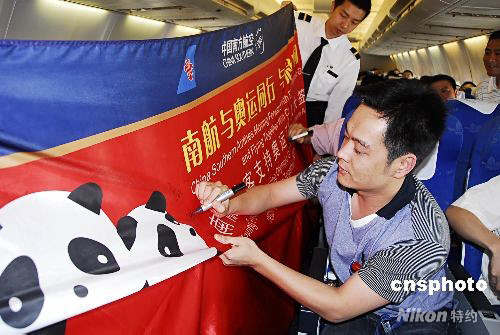 4月30日,北京奧運(yùn)倒計(jì)時100天,南航廣州——貴陽的CZ三四一一、CZ三四一二航班上,“南航與奧運(yùn)同行與冠軍同飛 南航旅客支持奧運(yùn)百萬人大簽名”活動拉開序幕。中新社發(fā) 陳衛(wèi)華 攝