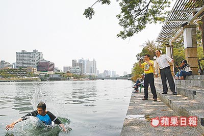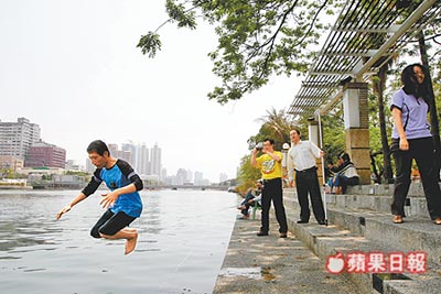 中新網(wǎng)3月30日電 為兌現(xiàn)選舉前的承諾, 42歲臺灣男子蔡柏祥昨天中午縱身跳入高雄市愛河。