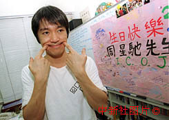 香港明星周星馳,十一日在香港介紹他將于九月開拍的新片《足球少林》。 中新社傳真 王瑤攝