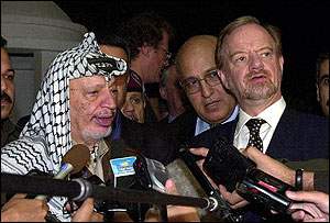 圖文:巴以美三方將舉行最高級會議 2000年10月12日 15:20 ![]() 歐盟外交事務官索拉納(左)會見約旦國王阿卜杜拉(右),討論化解以巴危機。 ![]() 英國外交大臣庫克(右)與巴勒斯坦領袖阿拉法特會晤,商討以巴局勢。 ![]() 以巴流血沖突今天再造成至少2人死亡。 中新網(wǎng)北京10月12日消息:經(jīng)過多日穿梭中東的“斡旋旅程”后,聯(lián)合國秘書長安南宣布,以巴領袖已經(jīng)同意參加由美國主持的三方高層安全會議,以停止以巴暴力沖突。而隨行的聯(lián)合國發(fā)言人埃克哈德表示,安南認為,這是終止以巴沖突,及重開以巴和平進程會談的重要一步。 估計峰會最早會在周四舉行。 以巴沖突今天進入第14天,多國高層官員及聯(lián)合國秘書長安南不停穿梭中東地區(qū),斡旋以巴;稹 聯(lián)合國發(fā)言人表示,這項于1998手成立的三方安全委員會大會,將首度由三方最高階層與會,以解決暴力沖突問題。而會議將由以巴雙方的高級軍官及安全官員出席,由美國中情局局長特內擔任主席。預計會議將在周四展開。 安南將會前往黎巴嫩,協(xié)助救出3名被黎巴嫩真主黨擄走的以軍。另一方面,以巴雙方并未證實會出席會議。因為以色列領袖巴拉克與巴勒斯坦領袖阿拉法特均要咨詢雙方的軍官。 埃及總統(tǒng)穆巴拉克則繼續(xù)拒絕在開羅召開四方峰會,認為峰會必須在以軍愿意撤離巴勒斯坦部地區(qū),及接受成立國際調查委員會,以了解事發(fā)原因。同時,希望在10月21日舉行阿拉伯峰會后,以巴雙方才展開會談。而意大利則提出愿作為峰會的會談場地。 以巴雙方領袖則繼續(xù)指責對方在成立國際調查委員會的細節(jié)上不肯讓步以及以軍在沖突中濫用暴力等。巴拉克發(fā)出警告說,巴國官方近日釋放了數(shù)名伊斯蘭激進分子,并讓他們發(fā)動恐怖襲擊,并呼吁以色列人要小心防衛(wèi)。 盡管以巴暴力沖突規(guī)模已縮少,但今日至少又有2名巴勒斯坦人在沖突中喪生。沖突已造成100多人死亡,數(shù)以千計的人受傷。(圖文據(jù)外電) |
