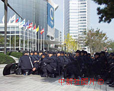 為使第三屆亞歐會議順利召開,韓國出動了將近三萬名警察。這是會場外的防暴警察在待命。中新社記者:王曉暉 攝