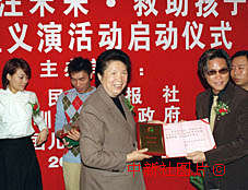 香港演藝界明星許志安、蘇永康、容祖兒,二十六日在北京人民大會(huì)堂中國兒童少年安康成長計(jì)劃工作委員會(huì)成立暨“關(guān)注未來·救助孩子”大型義演活動(dòng)啟動(dòng)儀式上捐贈(zèng)簽名光盤,并被授予愛心大使稱號(hào)。中新社記者 李剛 攝