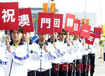 澳門電信局職工十六日手舉標(biāo)語牌,參加慶;貧w一周年的系列活動。中新社傳真 宗金柱攝