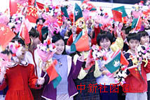 。國家主席江澤民和夫人王冶坪19日下午乘專機抵達澳門機場。150名小朋友手舉國旗、區(qū)旗和鮮花在機場歡迎江澤民主席和夫人抵達澳門。中新社傳真 滿會喬攝