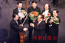 國家主席江澤民在旅歐青年大提琴家王健演奏中國民樂《二泉映月》后,稱贊他的演奏“動人心弦”。中新社傳真滿會喬攝