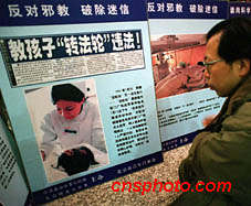 以“反對邪教、維護(hù)穩(wěn)定、崇尚科學(xué)、傳播文明”為主題的“青年文明社區(qū)反邪教行動”,二月在北京市全面啟動,揭批“法輪功”的圖片展在北京圖書大廈吸引讀者觀看。中新社圖 陸云 攝