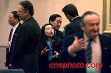 2月23日上午,國際奧委會評估團(tuán)在北京飯店第三次聽取北京奧申委的陳述報告。報告會前,中國著名乒乓球運動員鄧亞萍與國際奧委會評估團(tuán)成員親切交談。作者:趙彤杰