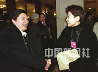 全國(guó)政協(xié)委員,著名歌唱家董文華和著名運(yùn)動(dòng)員王義夫在政協(xié)開幕式上喜相逢。中新社記者 錢興強(qiáng) 攝