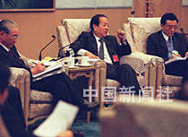 錢其琛副總理八日參加全國政協(xié)臺灣代表團(tuán)討論,答復(fù)臺灣委員提出的問題。中新社記者 宋吉河 攝