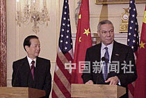 美東時(shí)間二十一日晚,中國國務(wù)院副總理錢其琛與美國國務(wù)卿鮑威爾,在美國國務(wù)院大樓舉行會(huì)談前會(huì)見記者,雙方希望繼續(xù)推進(jìn)中美兩國關(guān)系向前發(fā)展。中新社圖 京華 攝